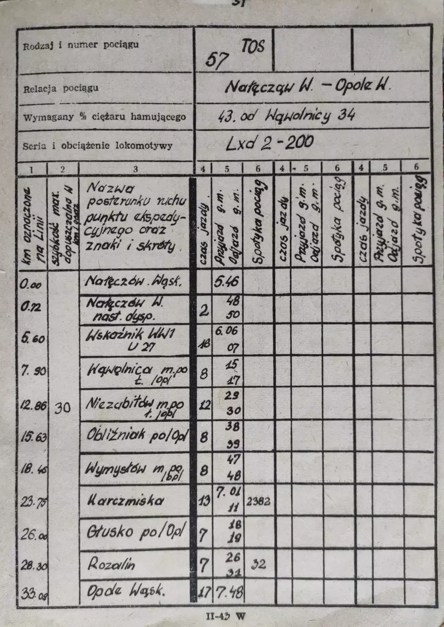 Pociąg pasażerski relacji Nałęczów Wąskotorowy - Opole Wąskotorowe, skan ze Służbowego Rozkładu Jazdy Pociągów Pasażerskich i Towarowych - zeszyt II-43W, strona 31 (RJ 1984/1985).