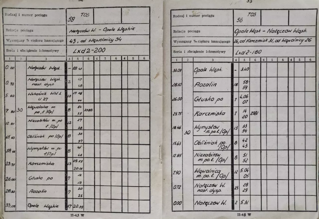 Pociągi pasażerskie na linii Nałęczów Wąskotorowy - Opole Wąskotorowe, skan ze Służbowego Rozkładu Jazdy Pociągów Pasażerskich i Towarowych - zeszyt II-43W, strony 32-33 (RJ 1984/1985).
