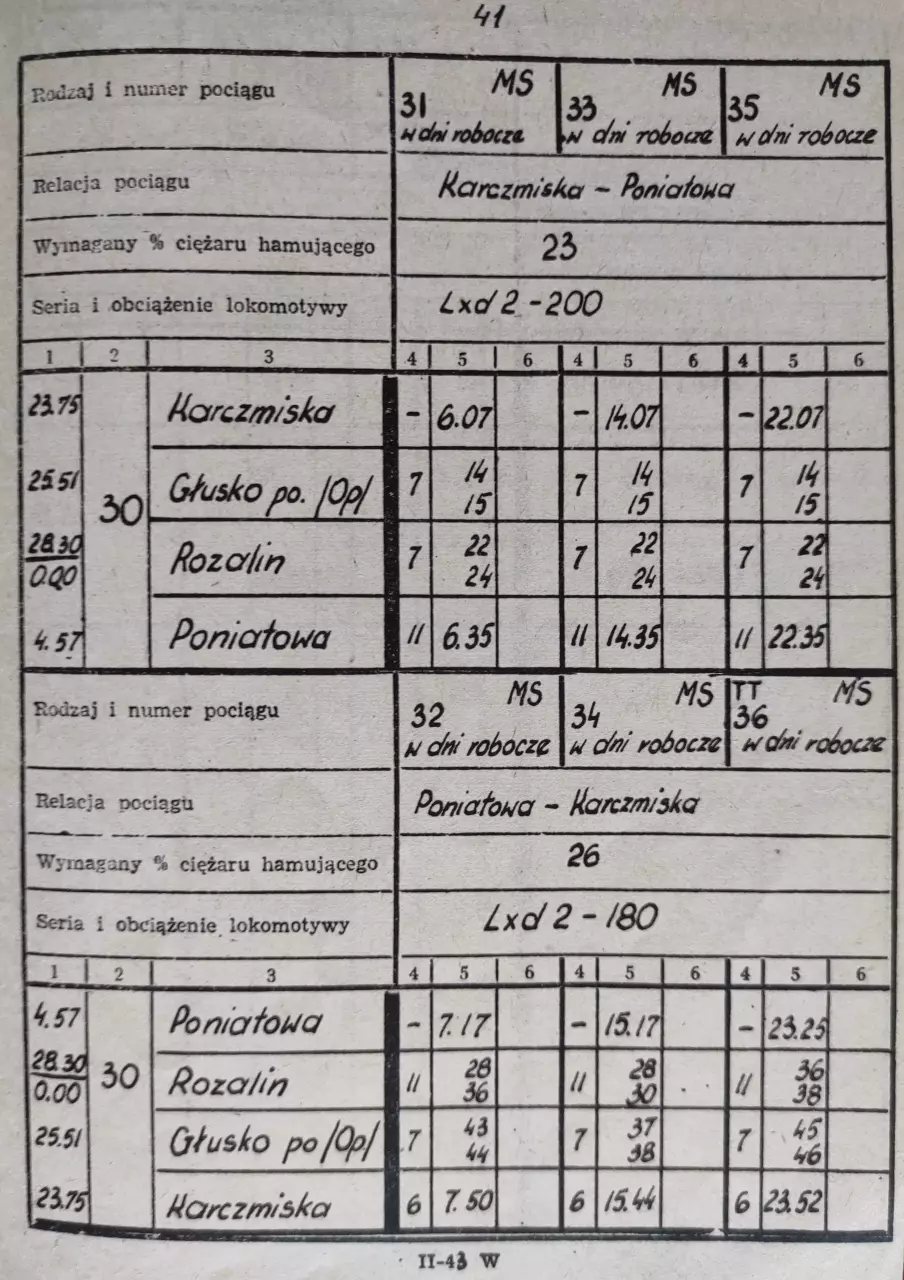Pociągi pasażerskie relacji Karczmiska - Poniatowa, Poniatowa - Karczmiska, skan ze Służbowego Rozkładu Jazdy Pociągów Pasażerskich i Towarowych - zeszyt II-43W, strona 41 (RJ 1984/1985).
