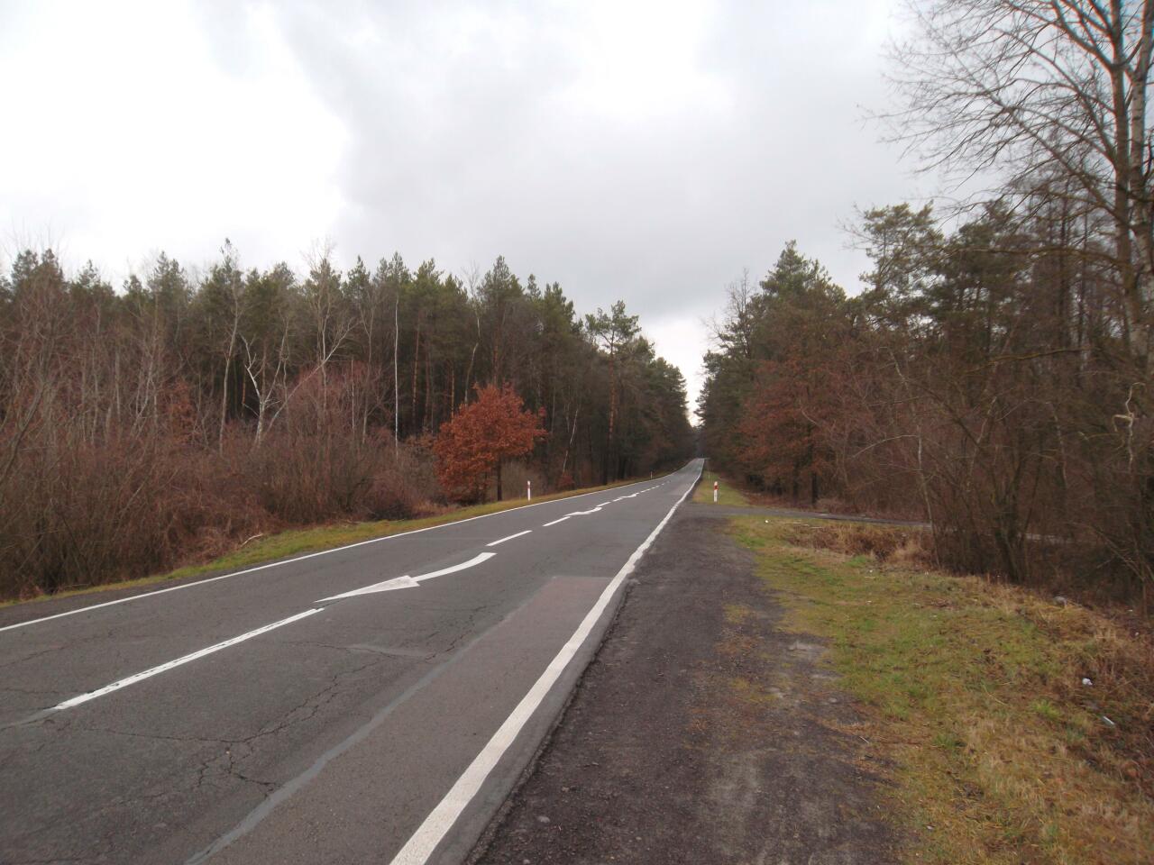 Zlikwidowany przejazd kolejowy przez DW 850, za nim starotorze. Po przekroczeniu szosy tor skręcał ostro na południe i biegł przez kilkaset metrów wzdłuż niej. Widok w kierunku południowo-wschodnim (Łaszczów).