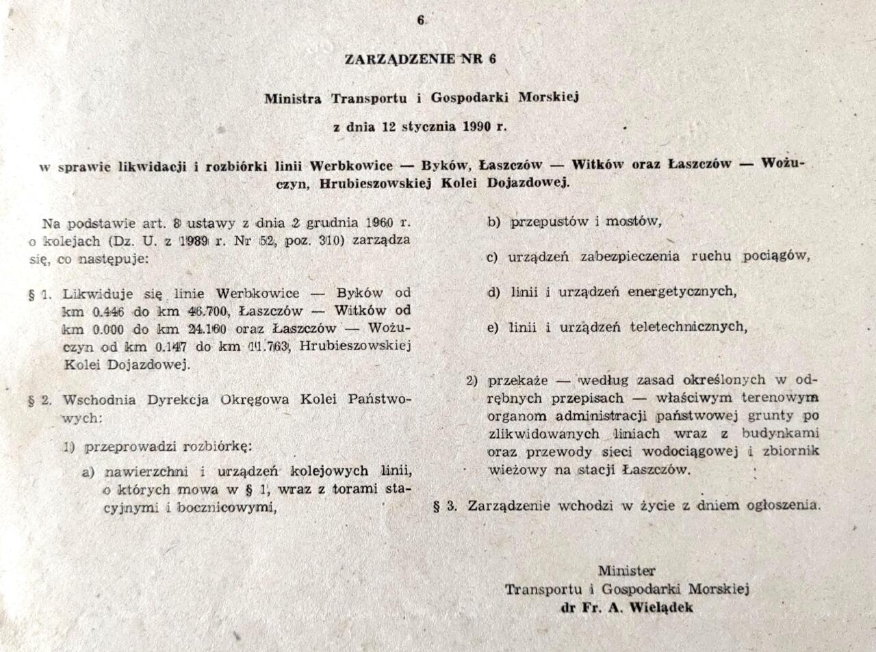 Zarządzenie Ministra Transportu i Gospodarki Wodnej dotyczące likwidacji i rozbiórki linii: Werbkowice Wąskotorowe - Byków, Łaszczów - Witków, Łaszczów - Wożuczyn.