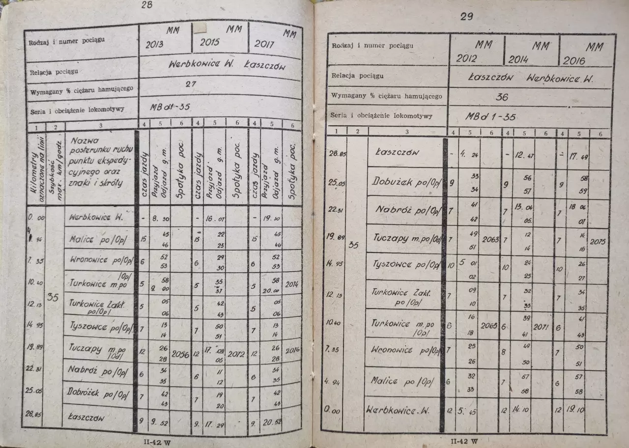 Pociągi pasażerskie na odcinku Werbkowice Wąskotorowe - Łaszczów, skan ze Służbowego Rozkładu Jazdy Pociągów Pasażerskich i Towarowych - zeszyt II-42W, strony 28-29 (RJ 1979/1980).