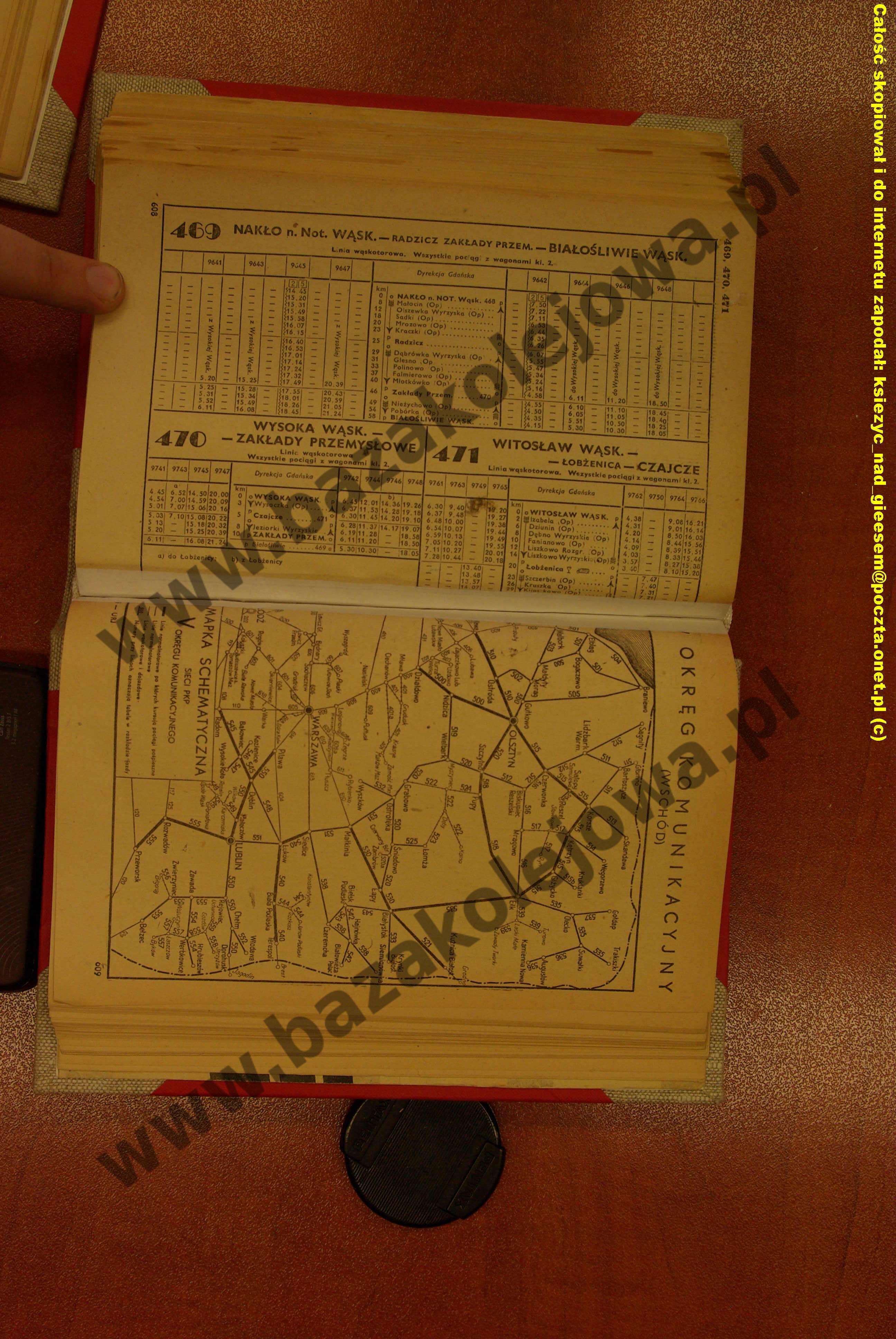 Rozkład Polska, lato 1958, Str. 608-609, Tab. 469, 470, 471; V okręg komunikacyjny (mapka)