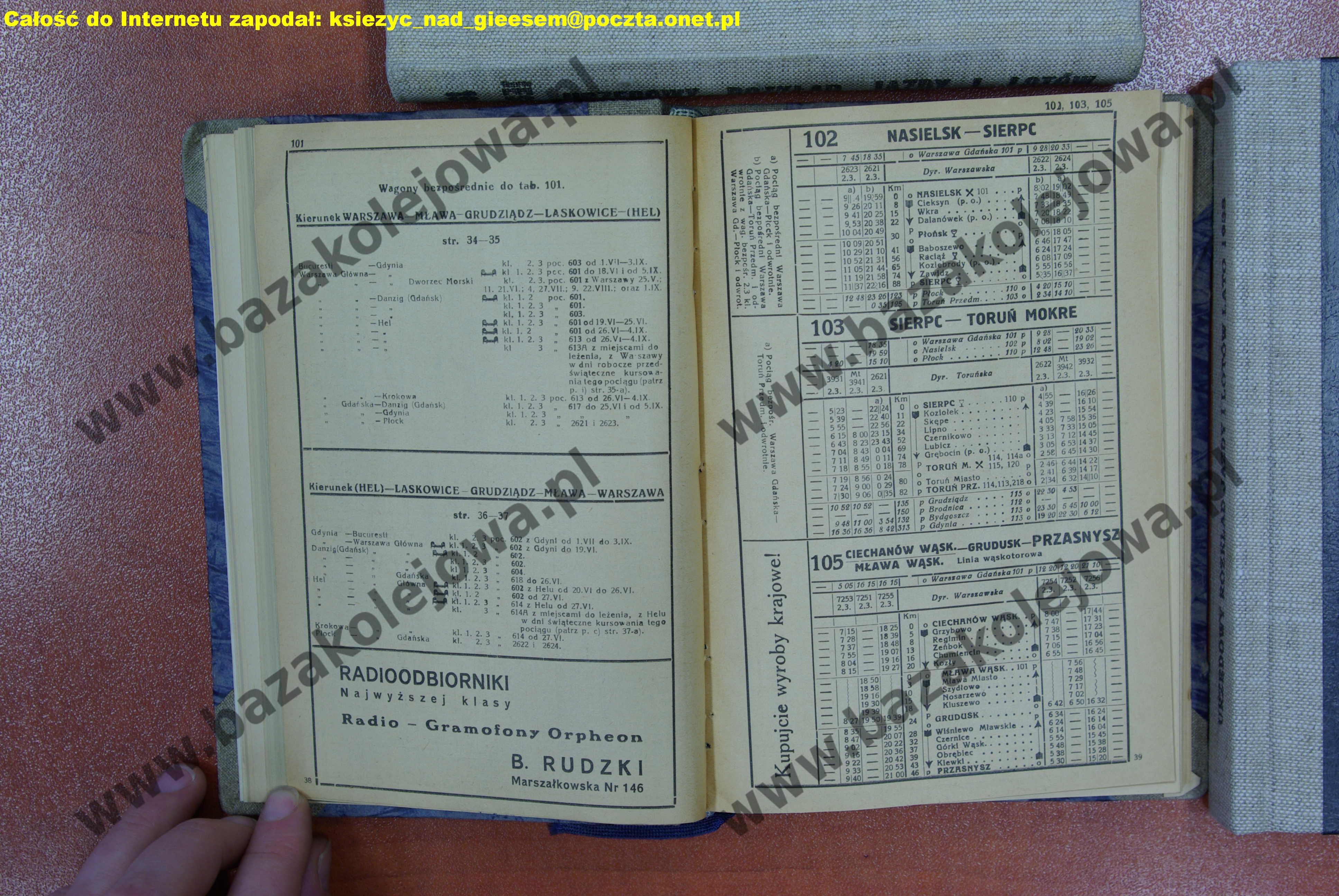 Rozkład Polska, lato 1937, Str. 38-39, Tab. 101, 102, 103, 105