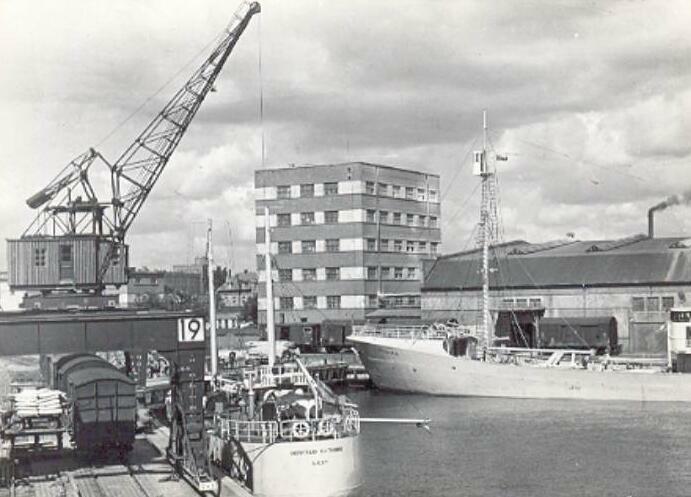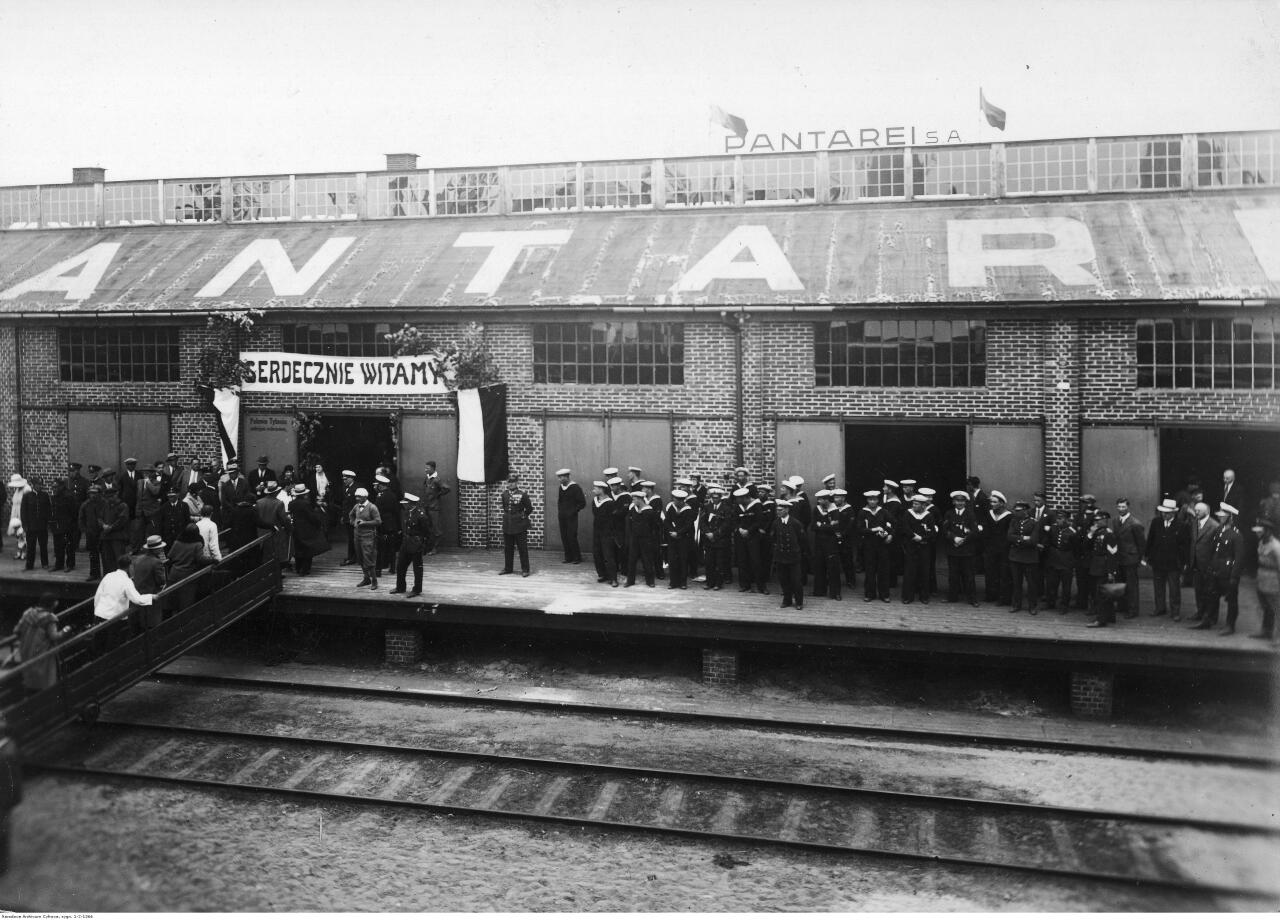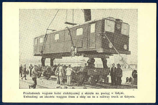 Fragment nabrzeża portu w Gdyni w jego wczesnym okresie - 1928 - pokazuje również obecność lokalnej kolei wąskotorowej, której tor i rozjazd widoczny jest na pierwszym planie.
