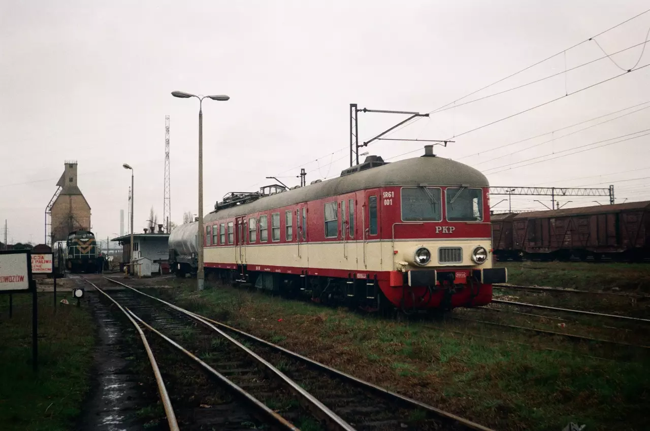 Stacja Gdynia Port - punkt tankowania spalinowych pojazdów trakcyjnych, wieża węglowa, wagon spalinowy SR61-001 (MD Gdynia Grabówek), z prawej grupa torów towarowych między posterunkami Gdynia Port GPA - Gdynia Port GPB. Widok w kierunku stacji Gdynia Port GPF.