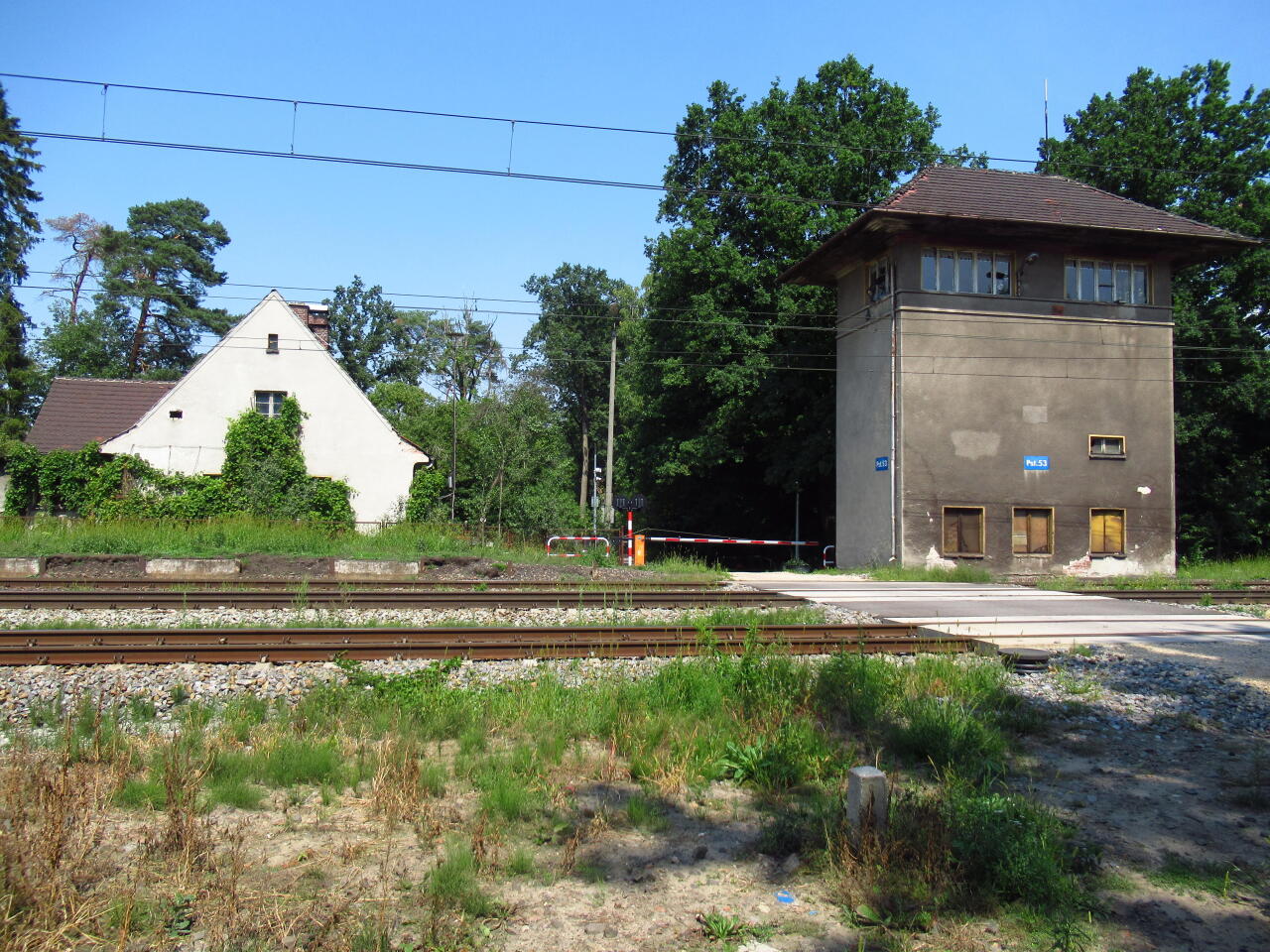 | Bardzo wysoki budynek dawnej nastawni w ostatnim czasie służył jako strażnica przejazdowa. Obsługę przejazdu zniesiono 1 kwietnia 2020 roku. |