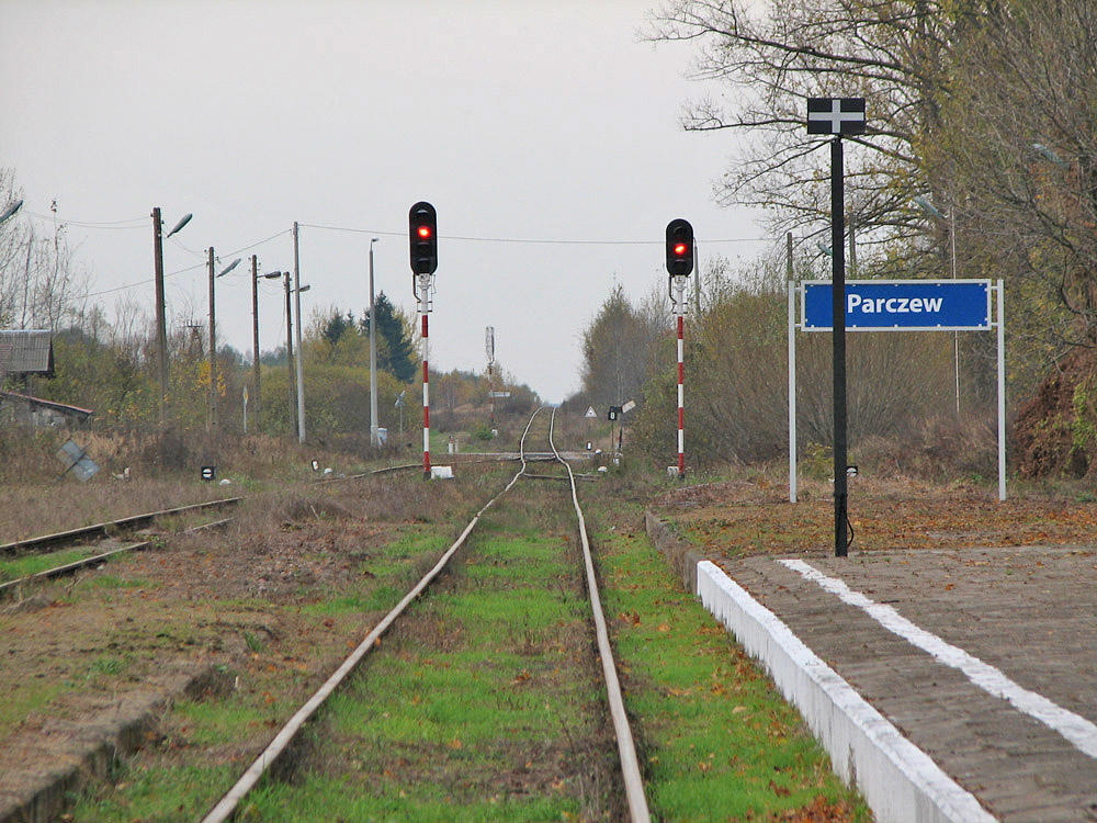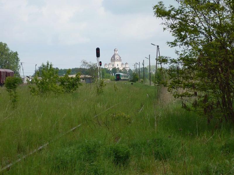 Głowica wjazdowa stacji Parczew od strony Łukowa - w tle kościół pw. Opatrzności Bożej. Widok w kierunku Łukowa.