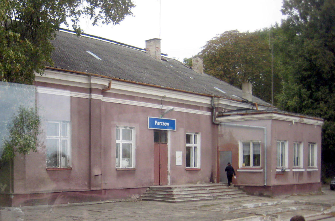 Tablica Parczew a przy niej załoga ITK. W tle budynek dworca. Widok od strony Łukowa.
