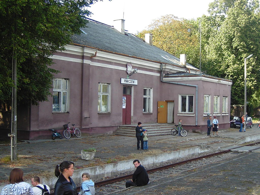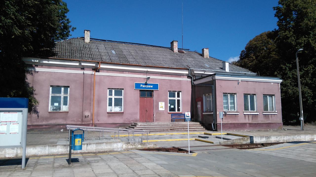 Budynek dworca PKP w Parczewie. Widok od strony peronów; w lewo Lublin, w prawo Łuków.