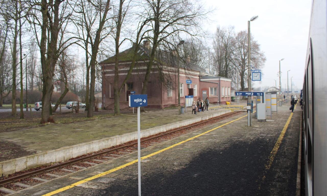 Budynek dworca od strony Lublina i wjazdu z Lublina. Zdjęcie wykonane podczas przejazdu pociągu promocyjno - turystycznego do Łukowa.