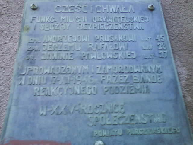 Tablica na dworcu w Parczewie. "Cześć i chwała funkcjonariuszom MO i SB zamordowanym przez bandę reakcyjnego podziemia.".