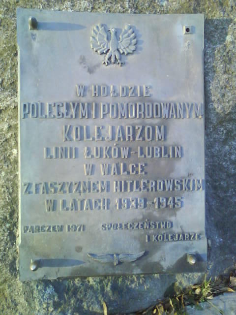 Tablica na dworcu PKP w Parczewie ku pamięci poległym i pomordowanym kolejarzom linii Łuków - Lublin w walce z faszyzmem hitlerowskim w latach 1939 - 1945.