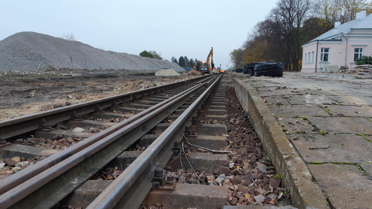 Przebudowa stacji Parczew km 53+145 w ramach modernizacji odcinka Parczew-Lubartów w latach 2020-21. Z prawej budynek dworca. Widok od strony Łukowa.