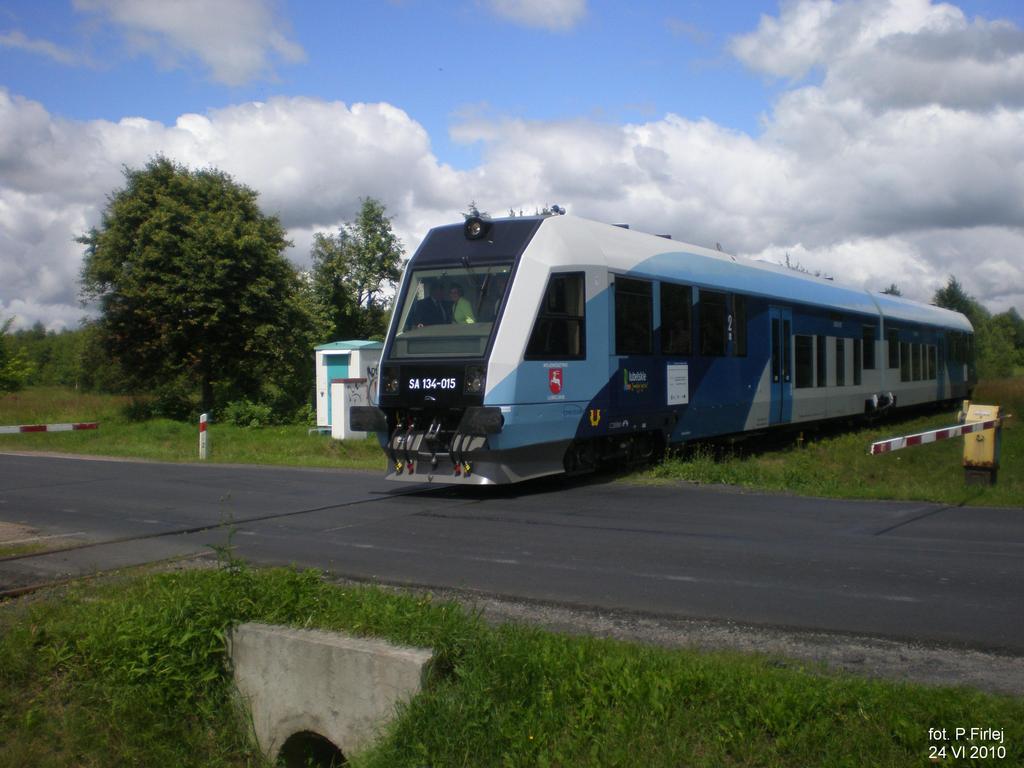Szynobus SA 134-015 jako pociąg specjalny odjeżdża do Lublina. Zdjęcie wykonane na przejeździe kolejowym przez drogę krajową nr 19.