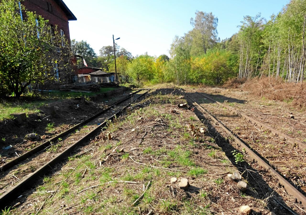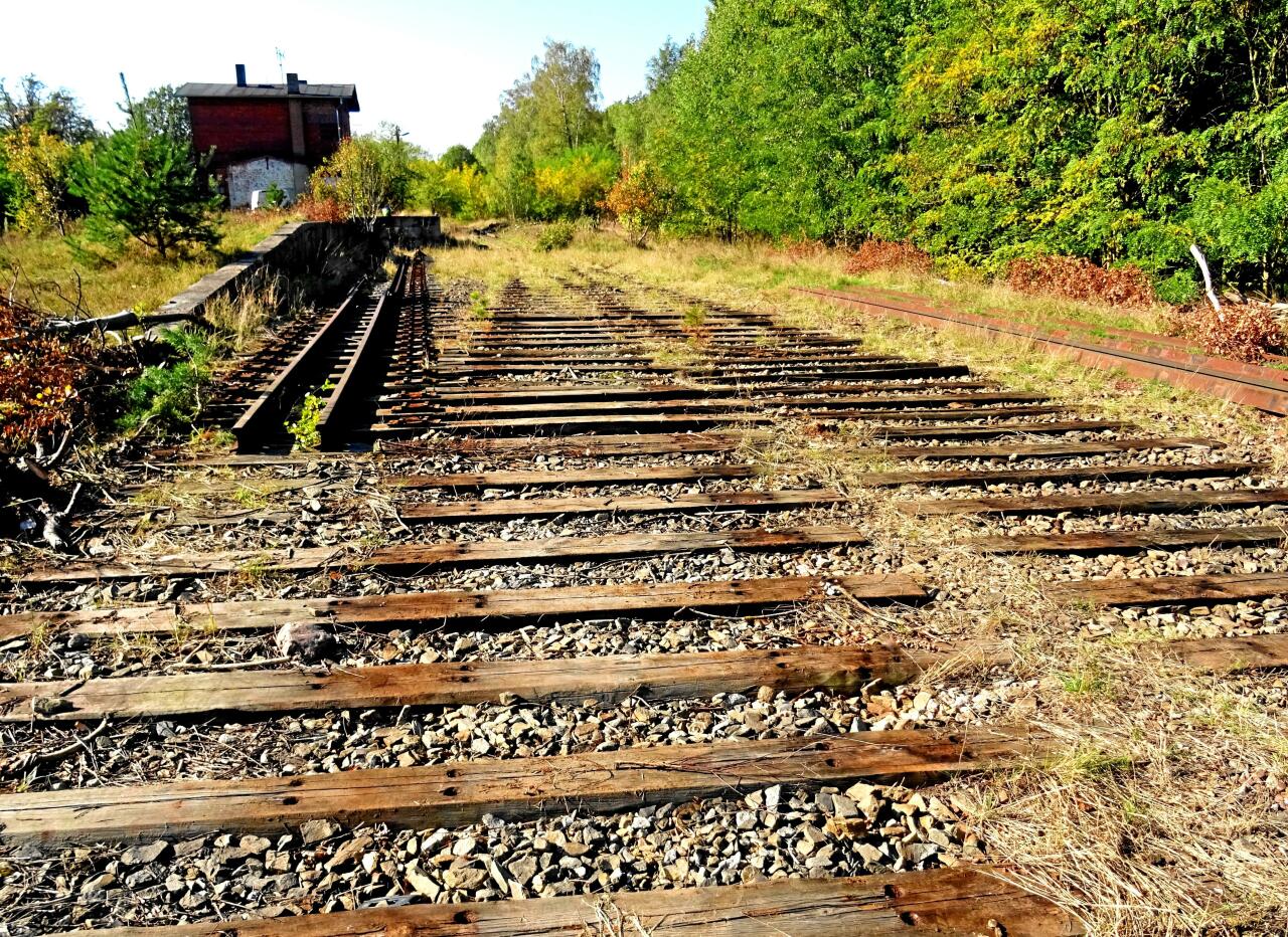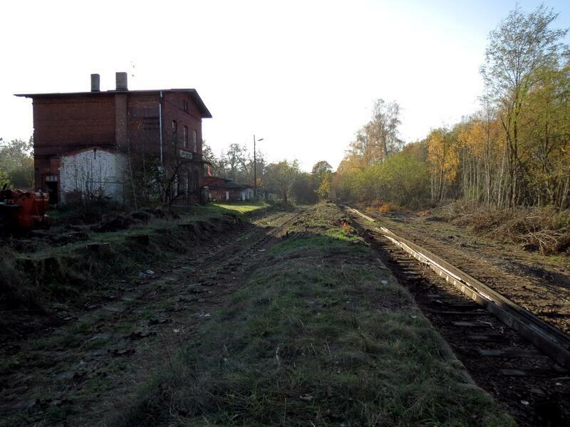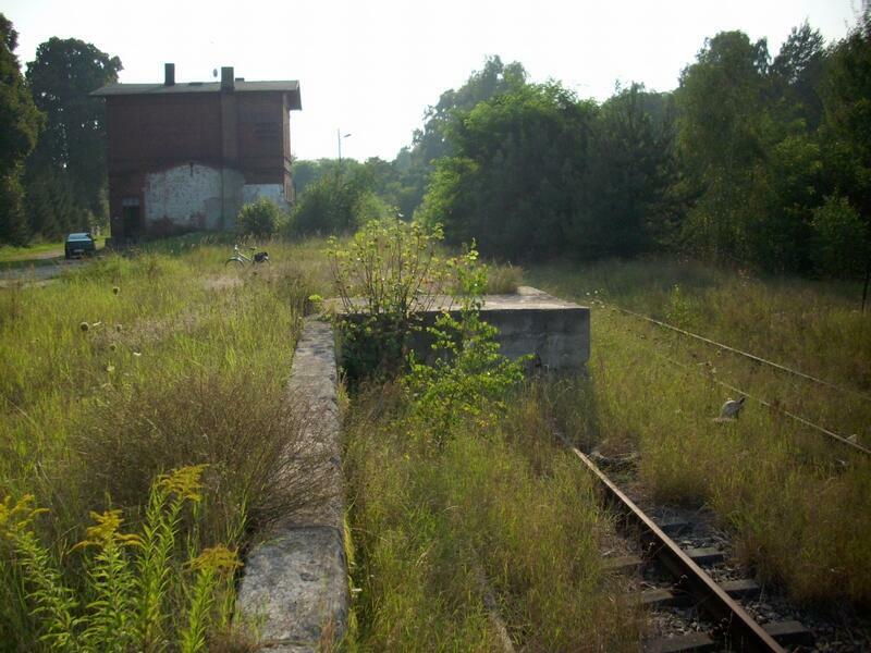 Widok na stację, coraz smutniejszy już niestety… brakuje lewego skrzydła budynku stacji, tory zarastają brzozami i świerkami. Z prawej linia główna na Żagań, tor z lewej prowadzi na byłe lotnisko radzieckie, obecnie Tomaszowo. Jak na razie bocznica na lotnisko jest zachowana w stanie idealnym.
