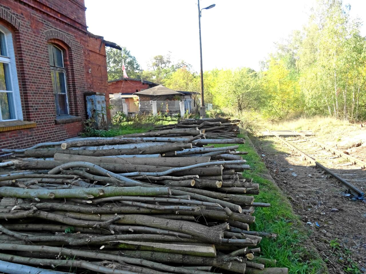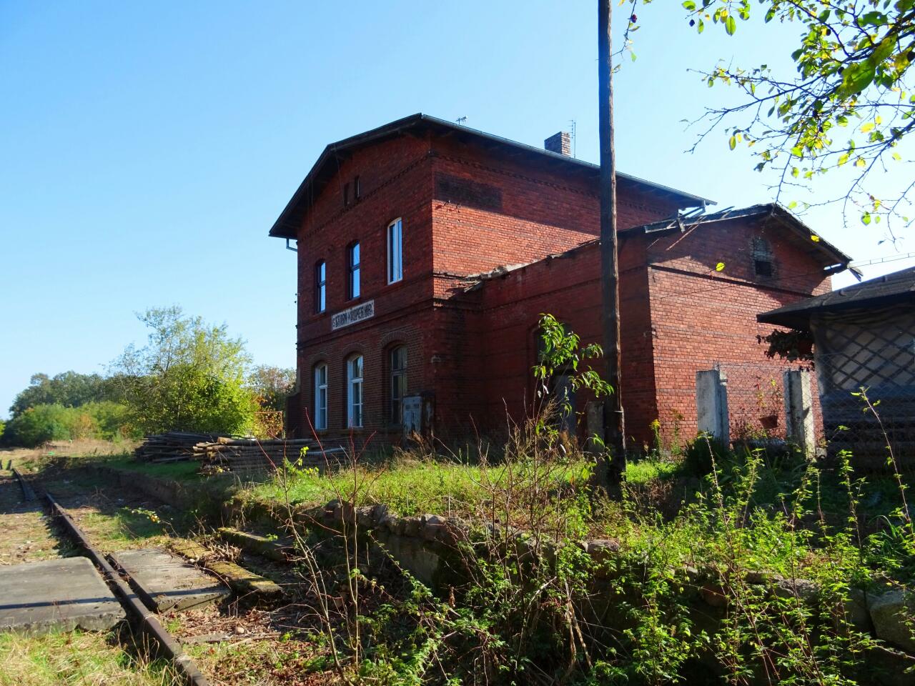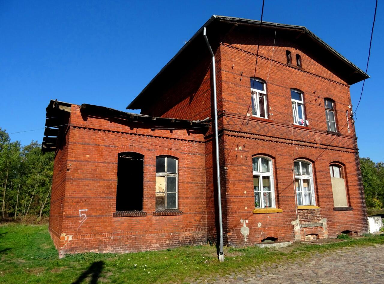 Widok na stację, coraz smutniejszy już niestety… brakuje lewego skrzydła budynku stacji, tory zarastają brzozami i świerkami. Z prawej linia główna na Żagań, tor z lewej prowadzi na byłe lotnisko radzieckie, obecnie Tomaszowo. Jak na razie bocznica na lotnisko jest zachowana w stanie idealnym.