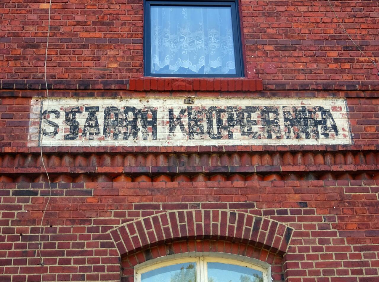 Stara Kopernia na budynku dworcowym prześwitująca poprzednia nazwa do 1945 r. Küpper.