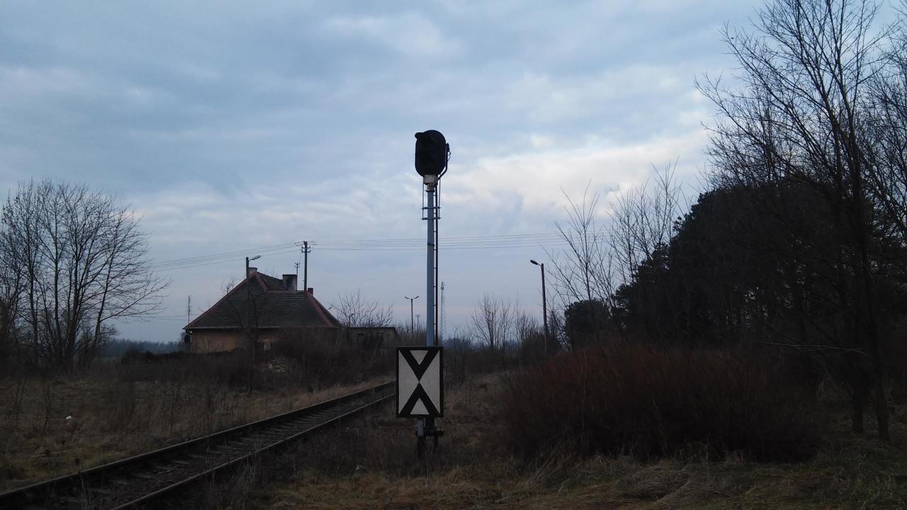 Tarcza ostrzegawcza "ToK" semafora wjazdowego, a z nią dawny budynek dworcowy zaadaptowany na cele mieszkalne.