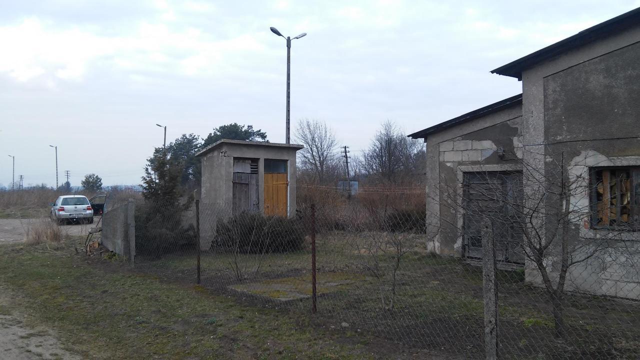 Zamknięty budynek magazynowy i spalony, dawny budynek dworcowy.
