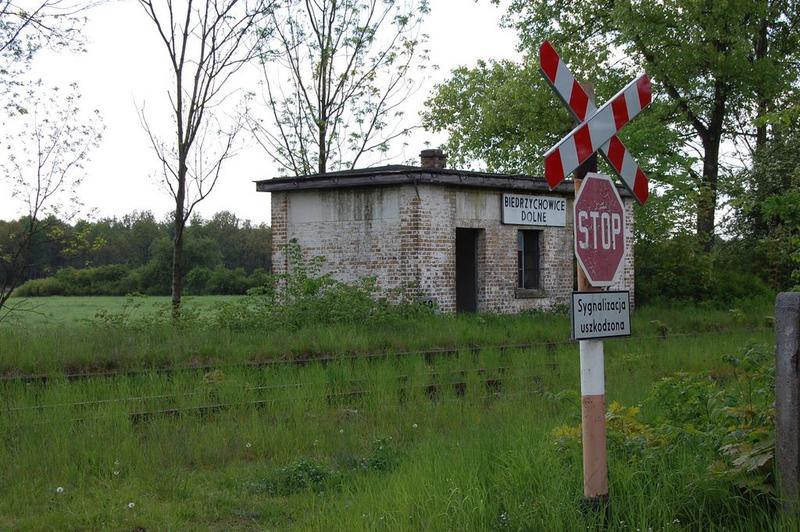 Opis infrastruktury: Stacyjka w Biedrzychowicach składa się z budynku, w którym prawdopodobnie była kasa biletowa - obecnie jest on w stanie destrukcji, zapadł się dach, a z otworów okiennych "wystają" rosnące wszędzie rośliny. Stoi on przy peronie 1, który został pozbawiony toru po wojnie, kiedy to linia Wrocław - Berlin stała się jednotorową linią lokalną kończącą się w Gubinku. Przy drugim peronie stoi poczekalnia z napisem BIEDRZYCHOWICE DOLNE, która posiada resztki ram okiennych. Za torem stoi budynek mieszkalny w stanie dobrym. Aby dojść od stacji do wsi należy przejść jeszcze przez spore pole, aby ujrzeć pierwsze jej zabudowania. Stacyjkę w Biedrzychowicach dzieli na pół polna droga z Surowej do Biedrzychowic. Perony są zachowane w dobrym stanie, zaś tor jest zarośnięty przez trawę, a główki szyn są prawie w całości zardzewiałe. (info: MKL, 2006-09-06) |