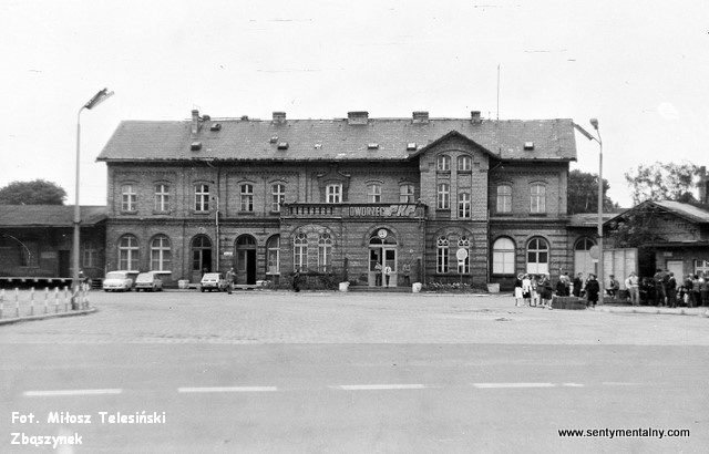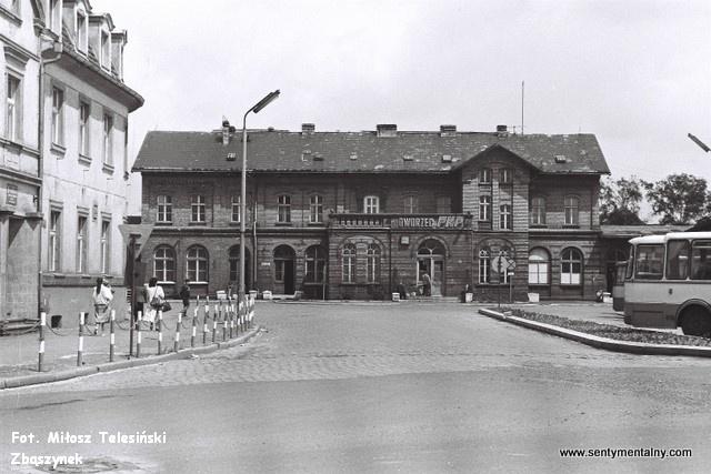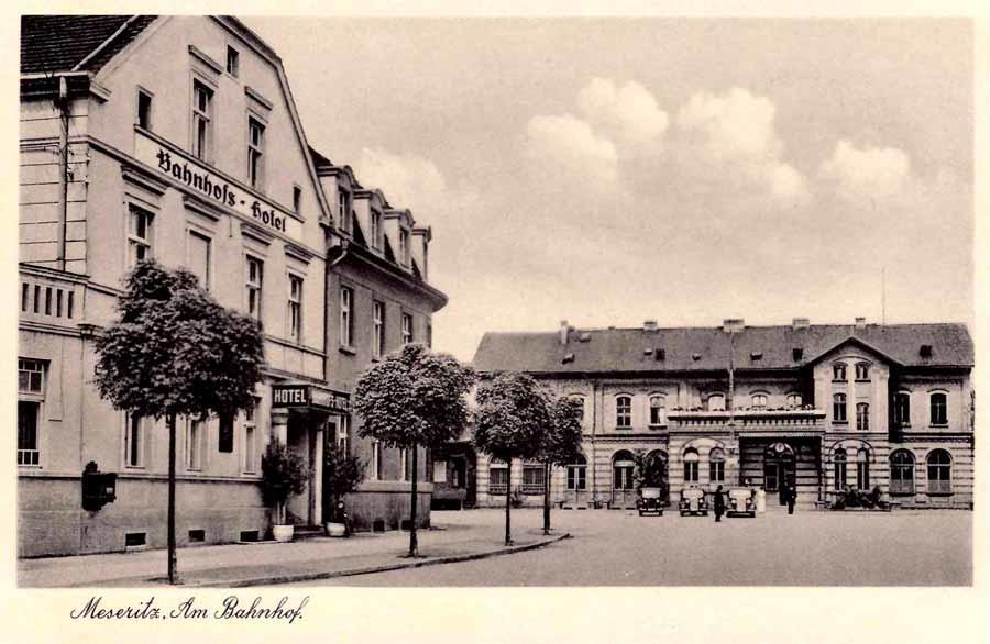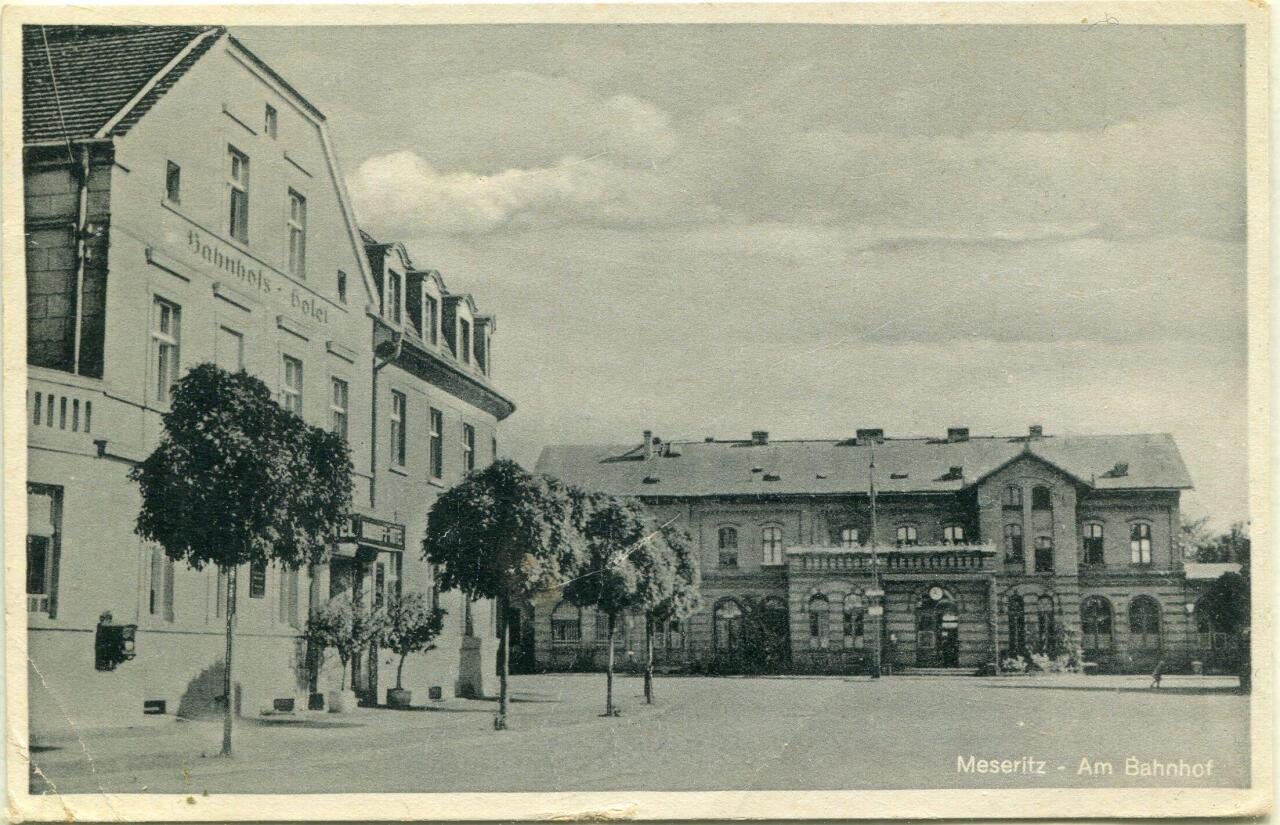 Plac dworcowy, hotel dworcowy (z lewej) i dworzec (na wprost) w Międzyrzeczu.