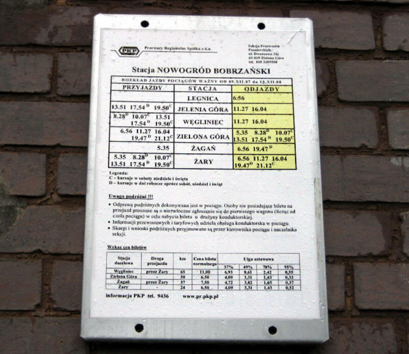 Nowogród Bobrzański PKP. Na budynku dworcowym umieszczono aktualny rozkład jazdy (2007/08).