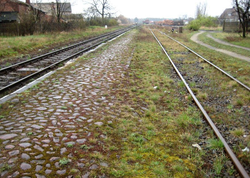 Nowogród Bobrzański PKP. Peron wybrukowany "kocimi łbami". Widok w stronę Zielonej Góry.