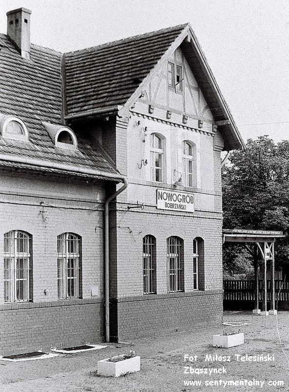Nieczynny budynek dworcowy i peron w Nowogrodzie Bobrzańskim pod koniec XX wieku. Widok w kierunku południowo-zachodnim (Nowogród Osiedle, Bieniów).
