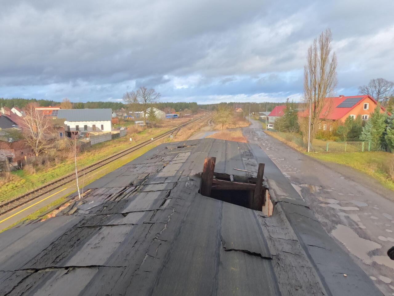 Widok z poddasza na północ w kierunku Zielonej Góry. Widoczna dziura w dachu magazynu.