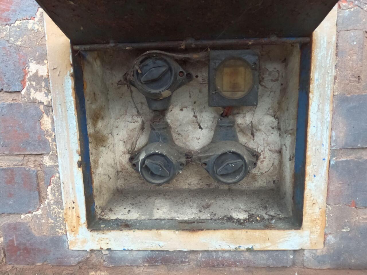 Skrzynka w ścianie budynku dworcowego od strony peronów. Zapewne od oświetlenia, którego obecnie brak.