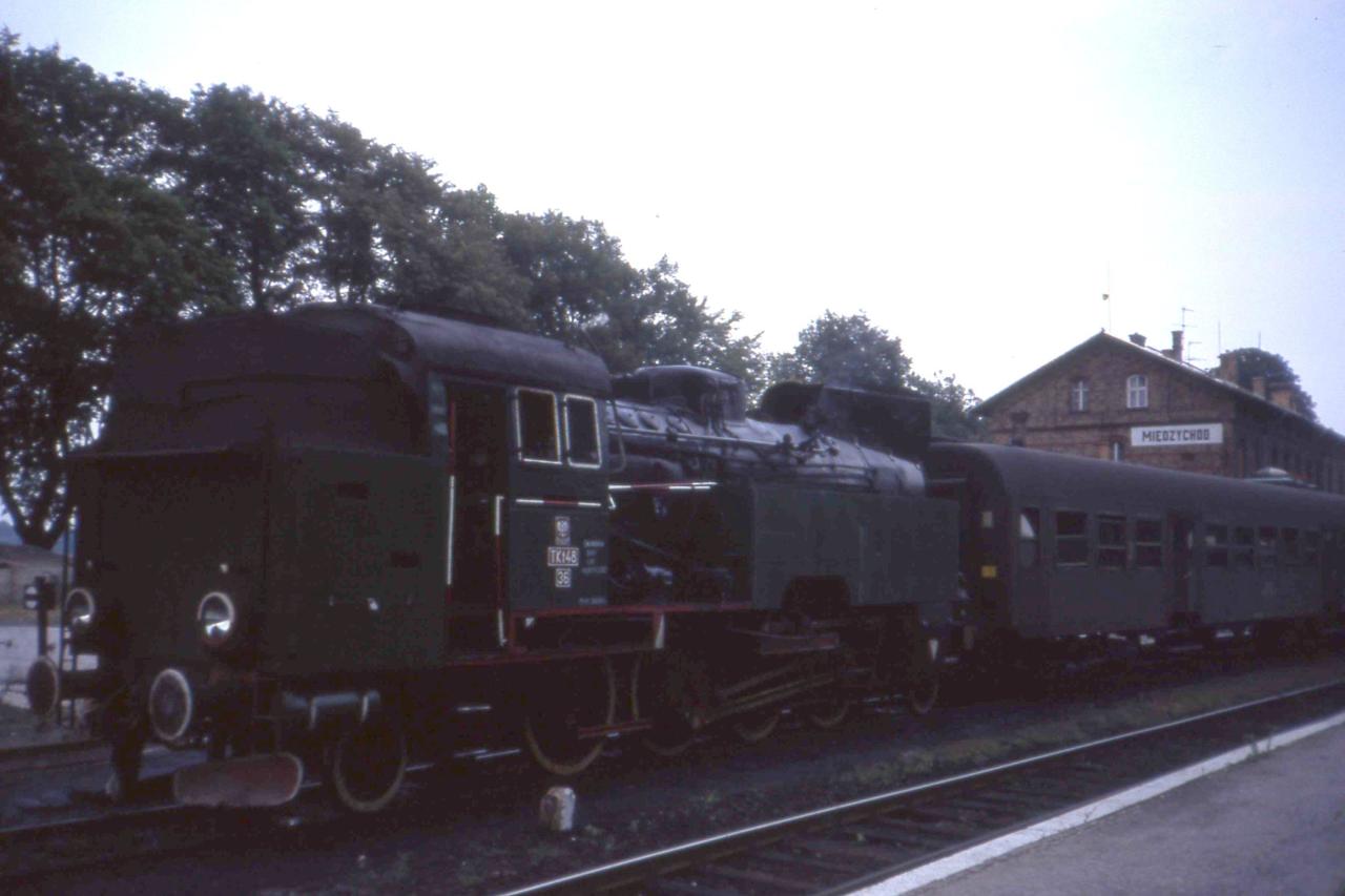 Stacja Międzychód, peron 2. Podczas przejazdy specjalnego (Zbąszynek - Międzyrzecz - Wierzbno - Międzychód - Skwierzyna Międzyrzecz - Zbąszynek) w dniu 03.10.1987 roku. Więcej op przejeździe na mojej stronie w dziale Zbąszynek. Z lewej peron 1, magazyn towarowy i budynek dworca. Na parterze dworca mieściła się nastawnia dysponująca. Widok w kierunku wschodnim, od strony wjazdu z Wierzbna (dalej Międzyrzecz, Skwierzyna).
