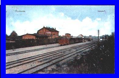 Stacja przed odzyskaniem niepodległości - 1917 r. Z lewej magazyn towarowy i budynek dworca. Widok w kierunku wschodnim, od strony wjazdu z Wierzbna (dalej Międzyrzecz, Skwierzyna).