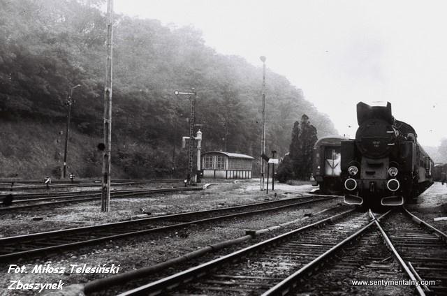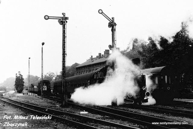 Pociąg do Szamotuł z Tekatką na czele opuszcza stację Międzychód. Na drugim planie widoczna szopa - wtedy już siedziba drogowców. Z lewej wiadukt w ciągu ul. Gorzyckiej. Widok w kierunku południowo-wschodnim: Rokietnica, Szamotuły, Zbąszyń.