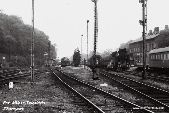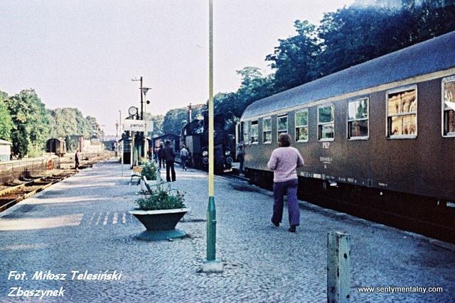 W centrum kadru pociąg osobowy relacji Poznań Główny - Międzyrzecz prowadzony Zemstą Ceausescu z bonanzami na haku. Z prawej strony skład do Gorzowa Wielkopolskiego zestawiony z Zemsty Ceausescu i Bipy. Pociągi osobowe do Zbąszynia już wtedy nie jeździły. Widok w kierunku wschodnim: Rokietnica, Szamotuły, Zbąszyń.