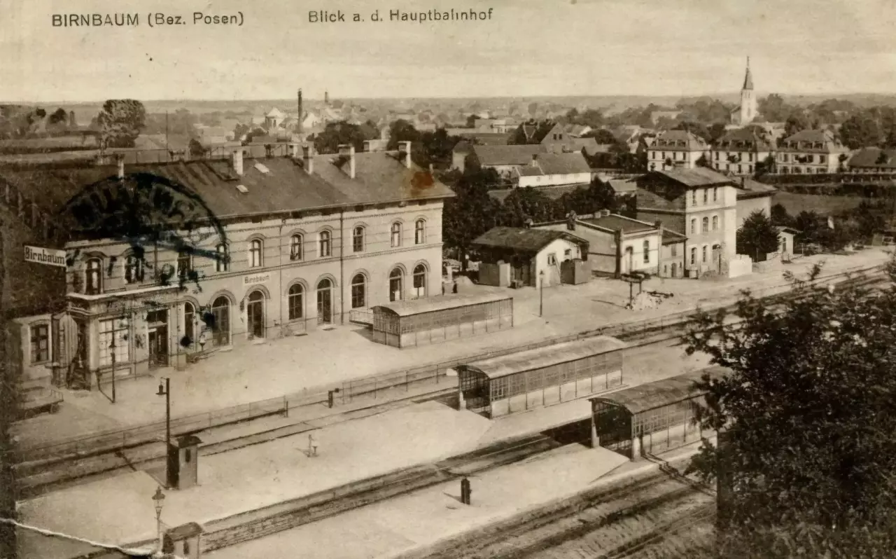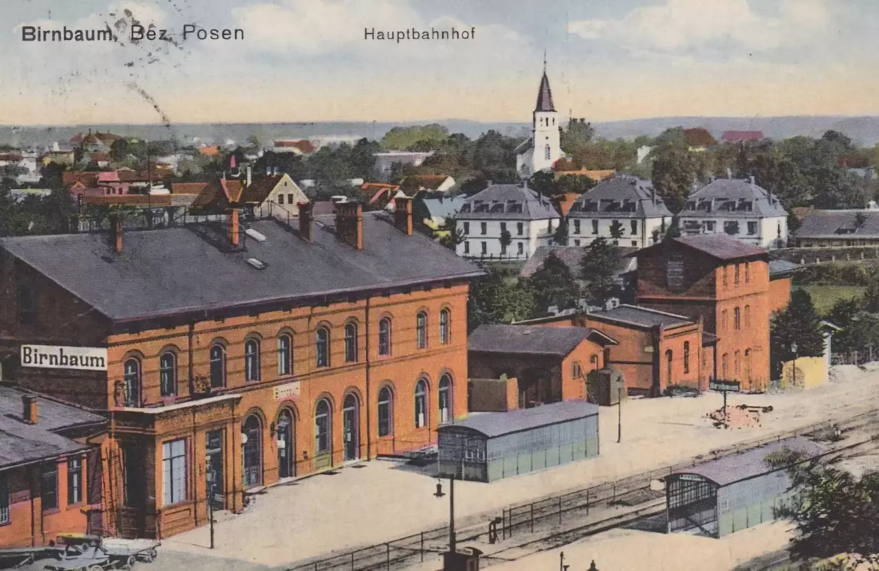 U góry pocztówki dworzec kolejowy od strony miasta. Widok w kierunku południowo-zachodnim: w lewo Szamotuły, Wronki, Zbąszyń, w prawo Wierzbno (dalej Międzyrzecz, Skwierzyna).