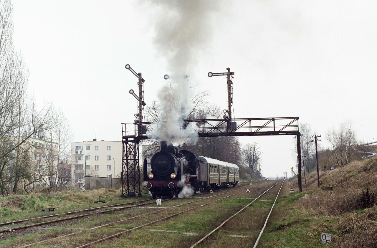 Wjazd pociągu specjalnego z Szamotuł do Skwierzyny. Widok w kierunku południowo-wschodnim: Rokietnica (tor środkowy), Szamotuły (tor lewy), Zbąszyń (tor prawy).
