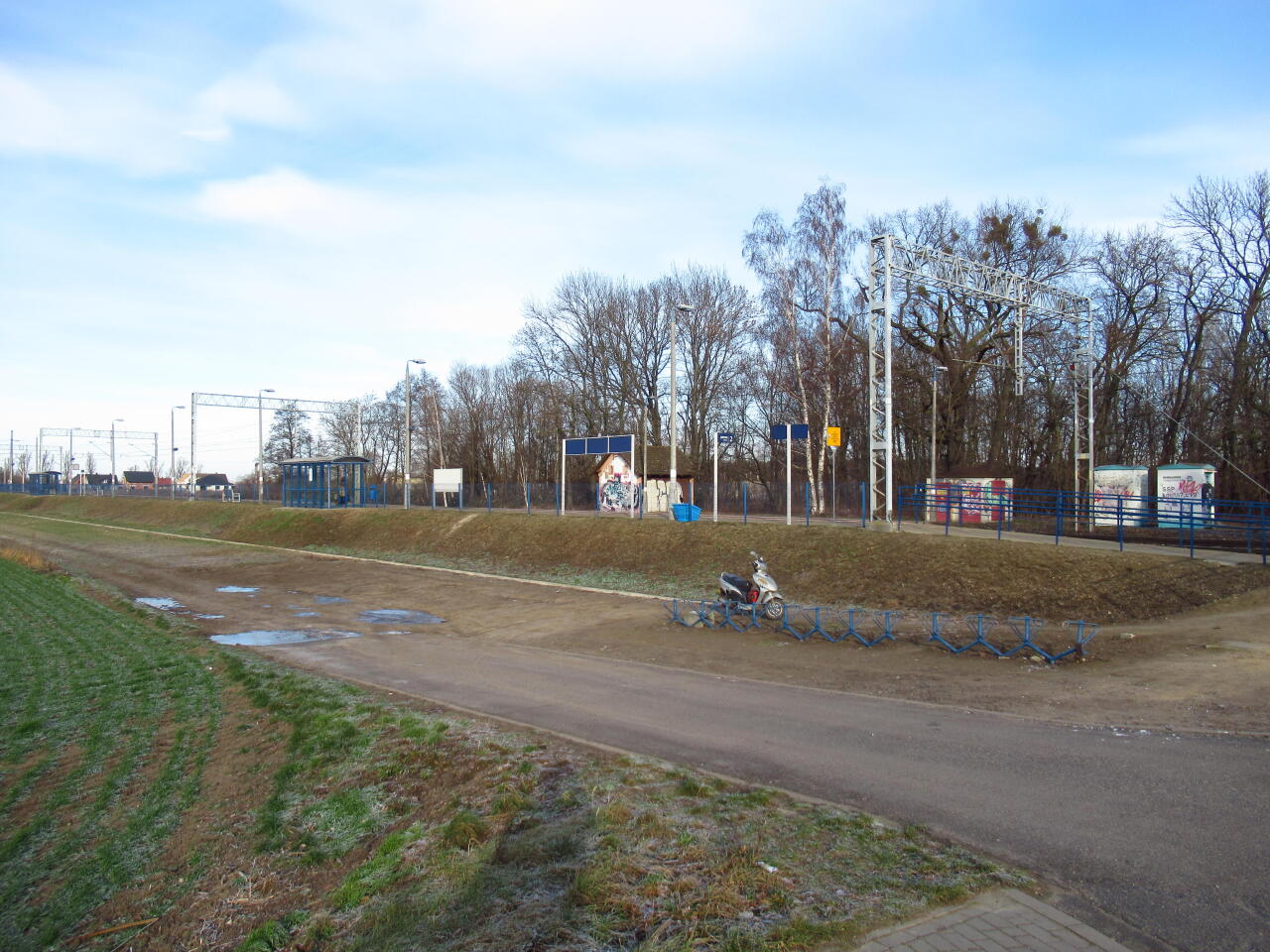 Na peronie stoi blaszana wiata. Opis infrastruktury: Obecnie po przebudowie istnieją dwa tory oraz dwa perony z wiatami po dwie na peron, przejazd sterowany automatycznie z zaporami (info: Jan Mazurkiewicz, 20-11-2008) Opis budynków: Budynek dawnego posterunku dróżnika ceglany z drewnianą nadbudową(przy torze w kierunku Wrocławia) który pełnił funkcję też i nastawni oraz kasy rozebrano w 2008 roku. Istniał jeszcze parterowy budynek po przeciwnej stronie toru pełnił on funkcję kasy i poczekalni zlikwidowany w latach 80-tych XX wieku. Z budynków pozostał tylko szalet przy torach w kierunku Wrocławia (info: Jan Mazurkiewicz, 20-11-2008). |