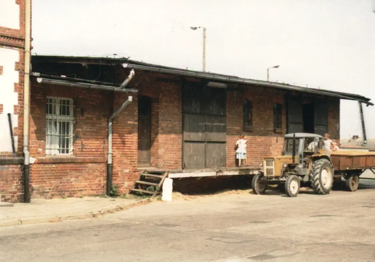 Magazyn towarowy i budynek dworca. Widok od strony miejscowości w kierunku zachodnim.