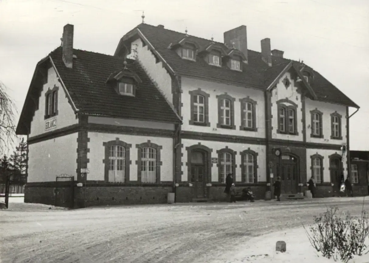 Widok z planu załadunkowego na budynek dworca od strony wjazdu z Kcyni. Kierunek południowo-zachodni.