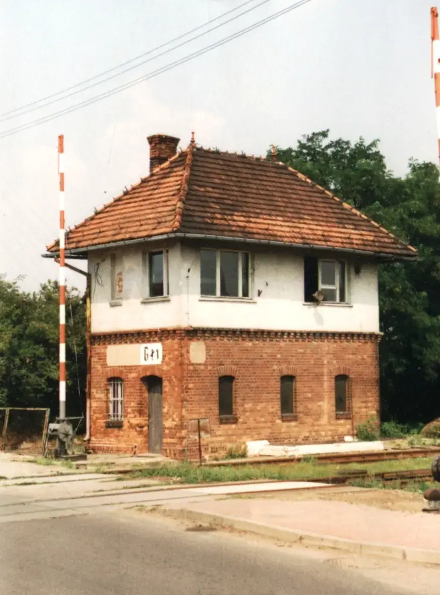 Nastawnia w Gołańczy, stojąca na wjazdach z Wągrowca i Chodzieży (z lewej) i przejeździe przez ul. Smolary. Widok w kierunku północno-wschodnim.