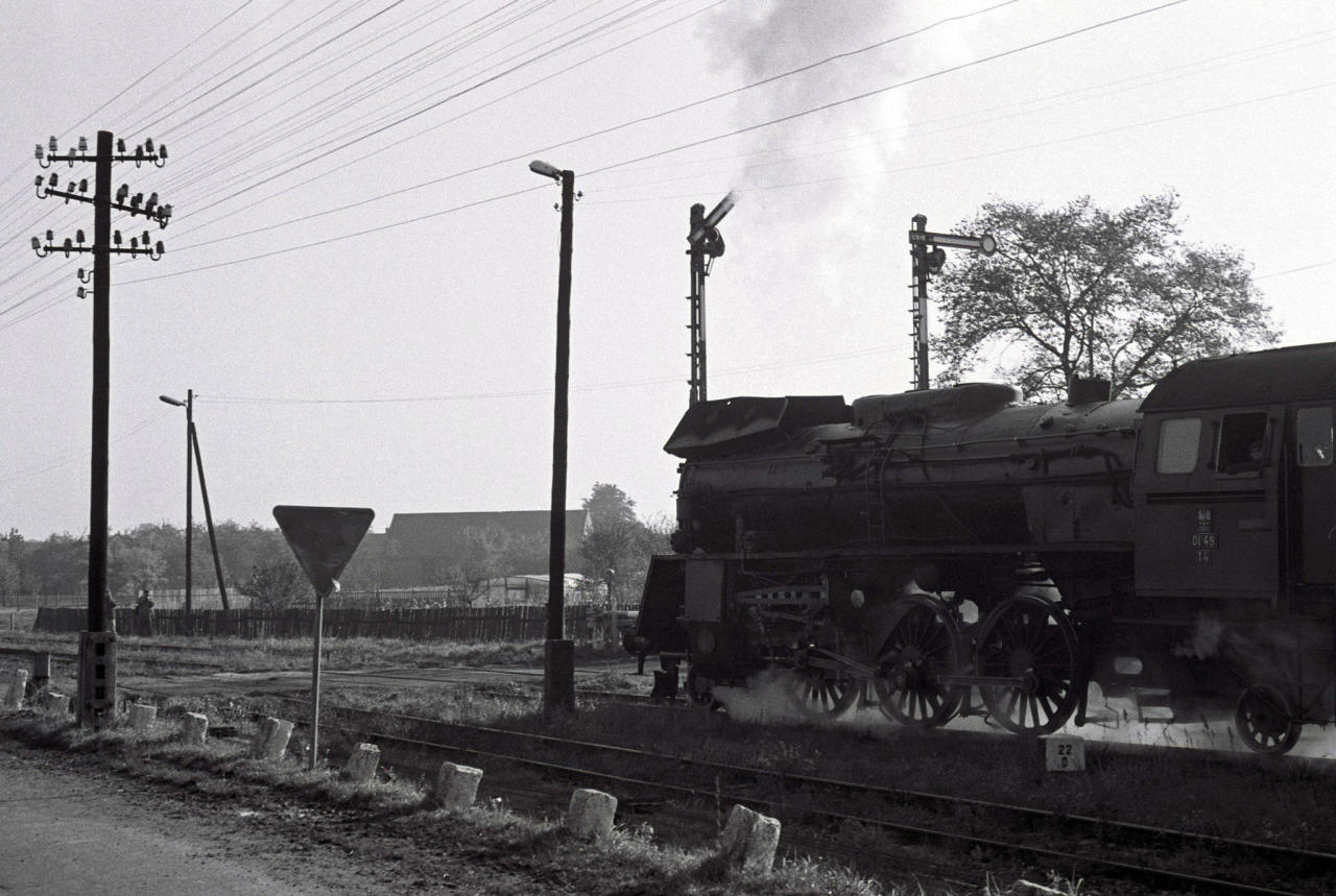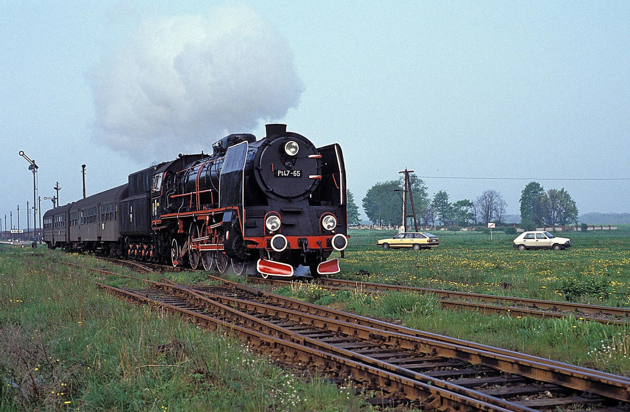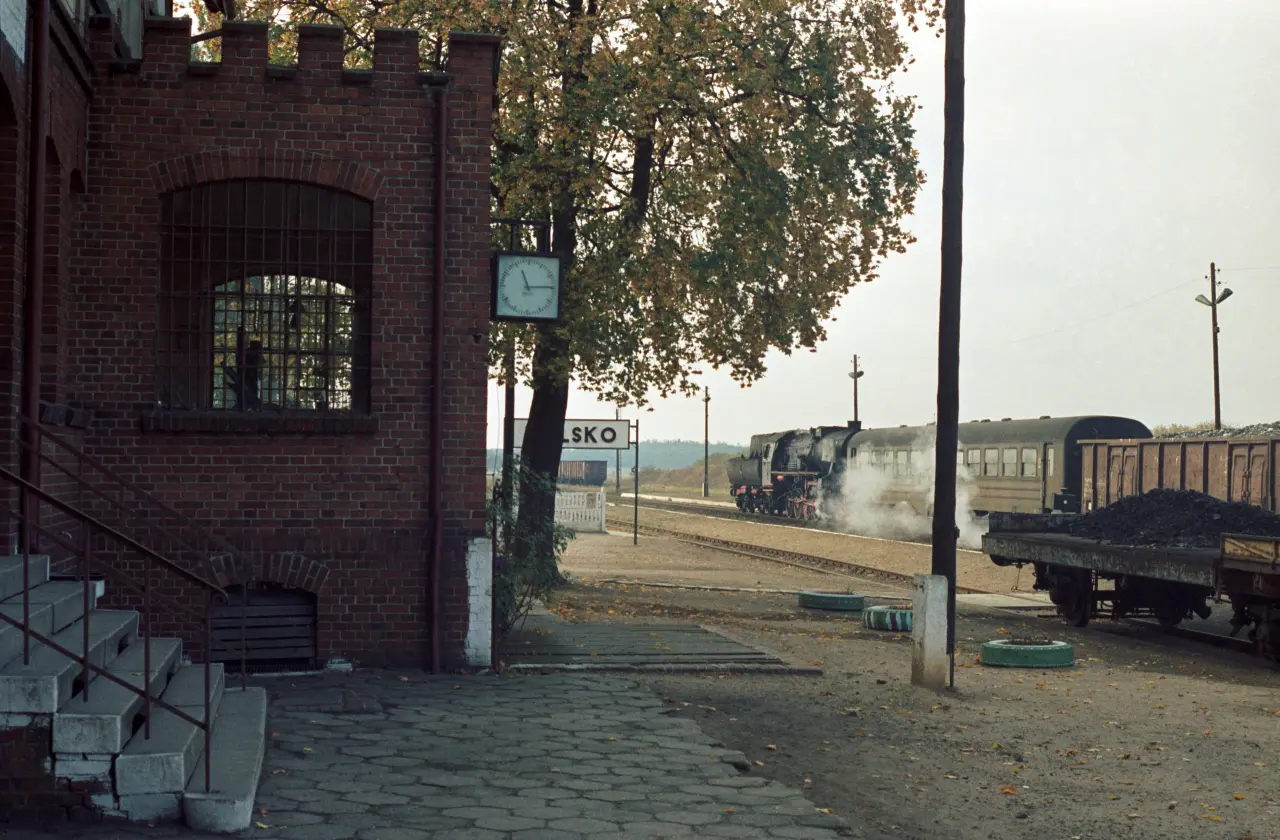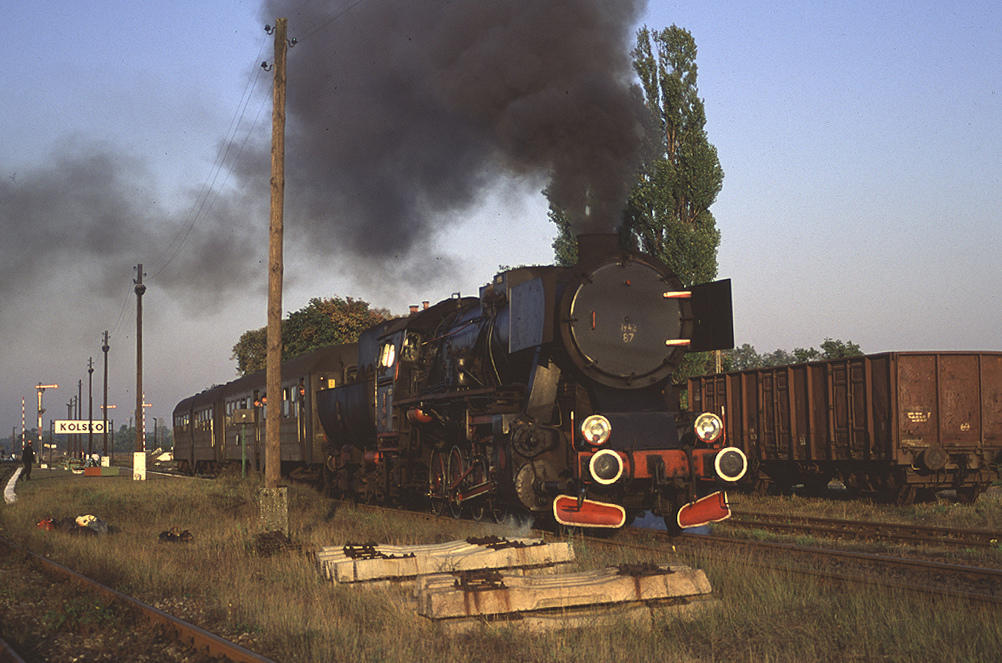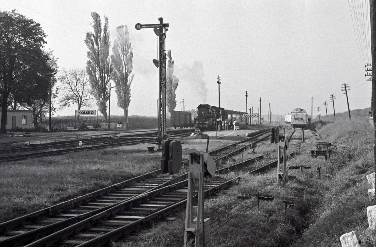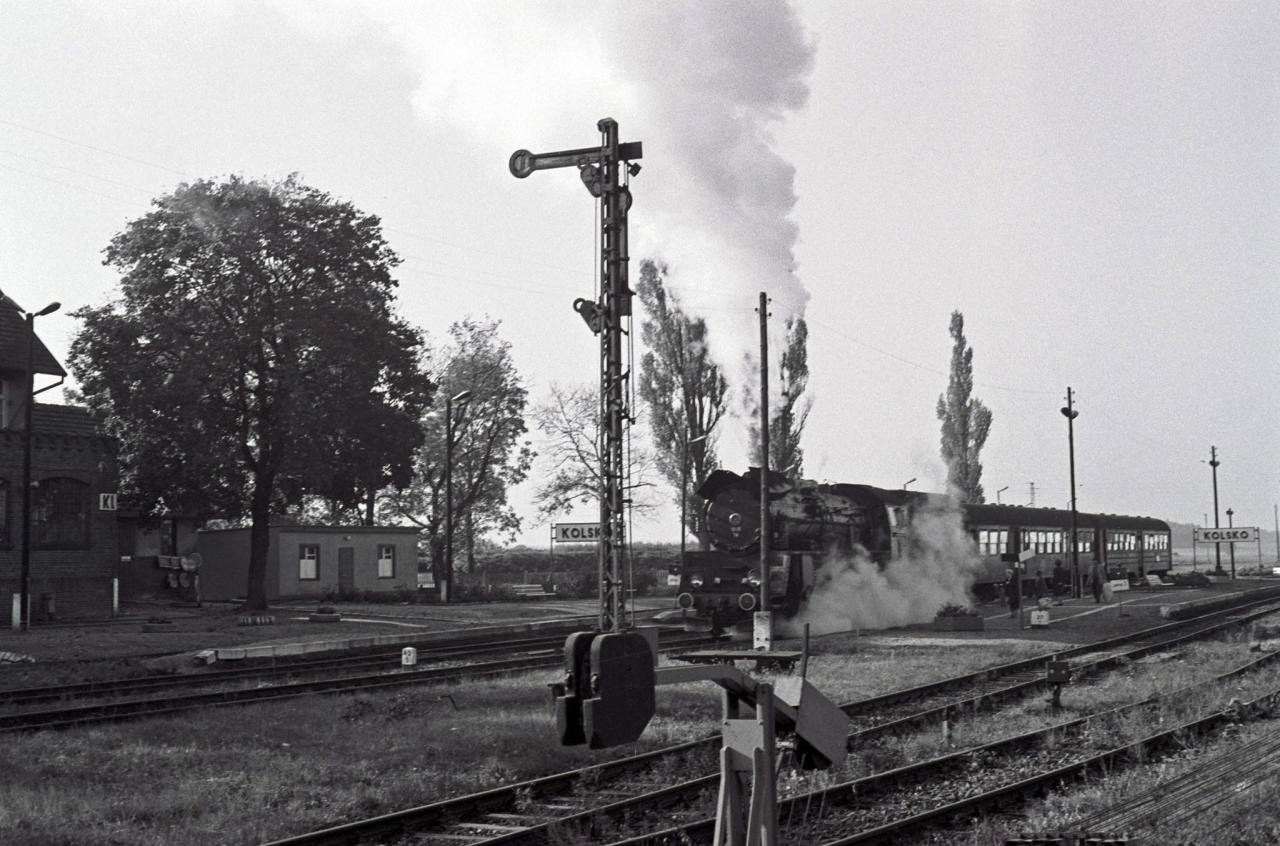 Pt47 z pociągiem Nowa Sól - Wolsztyn opuszcza stację Kolsko w stronę stacji docelowej. U schyłku epoki pary niegdyś prestiżowe Petuchy zostały zdegradowane do prowadzenia składów na podrzędnych liniach. Tor na pierwszym planie prowadził do Lipinek Głogowskich, gdzie rozdzielał się do Głogowa i Wschowy. Obecnie jest on fizycznie zlikwidowany. Widok w kierunku południowo-zachodnim (perony).