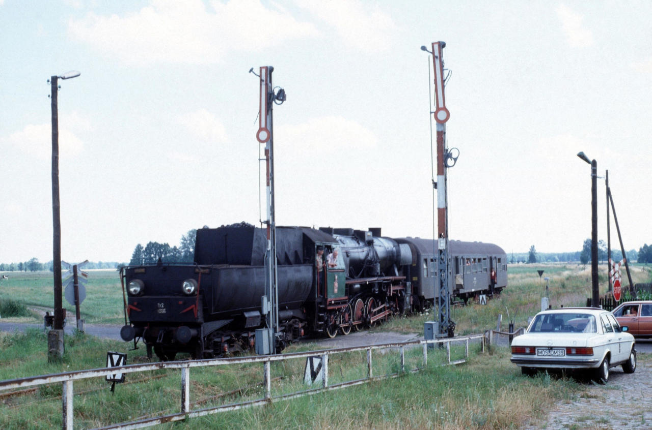 Północno-wschodnia głowica stacji Kolsko. Jak widać zamkniętej już wtedy dla czynności ruchowej. Krótki skład specjalny z Ty2 i bonanzą przejeżdża przez przejazd kolejowy na szosie do Kargowej. Widok w kierunku północnym (wyjazdy do Wolsztyna i Sławy Śląskiej).