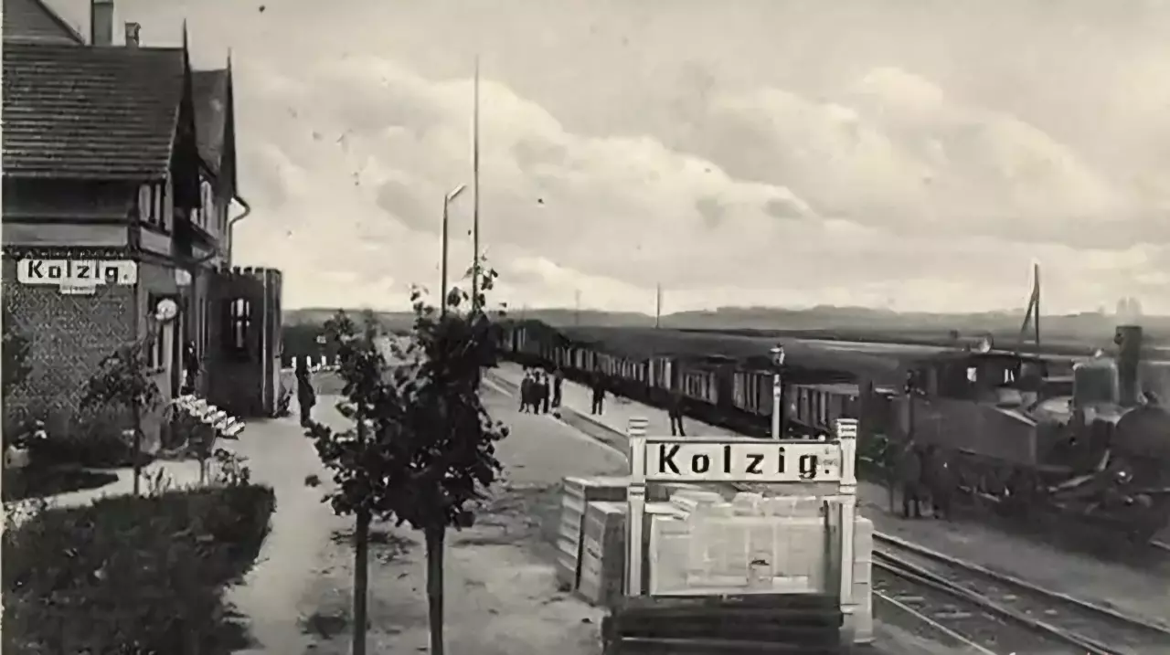Panorama stacji w Kolsku, na której zatrzymał się pociąg osobowy z Nowej Soli do Wolsztyna, trwa właśnie wymiana pasażerów. Z prawej strony, najprawdopodobniej odstawiony na bok skład wagonów-chłodni, z lewej strony krótka zdawka. Widok w kierunku południowo-zachodnim (Konotop).