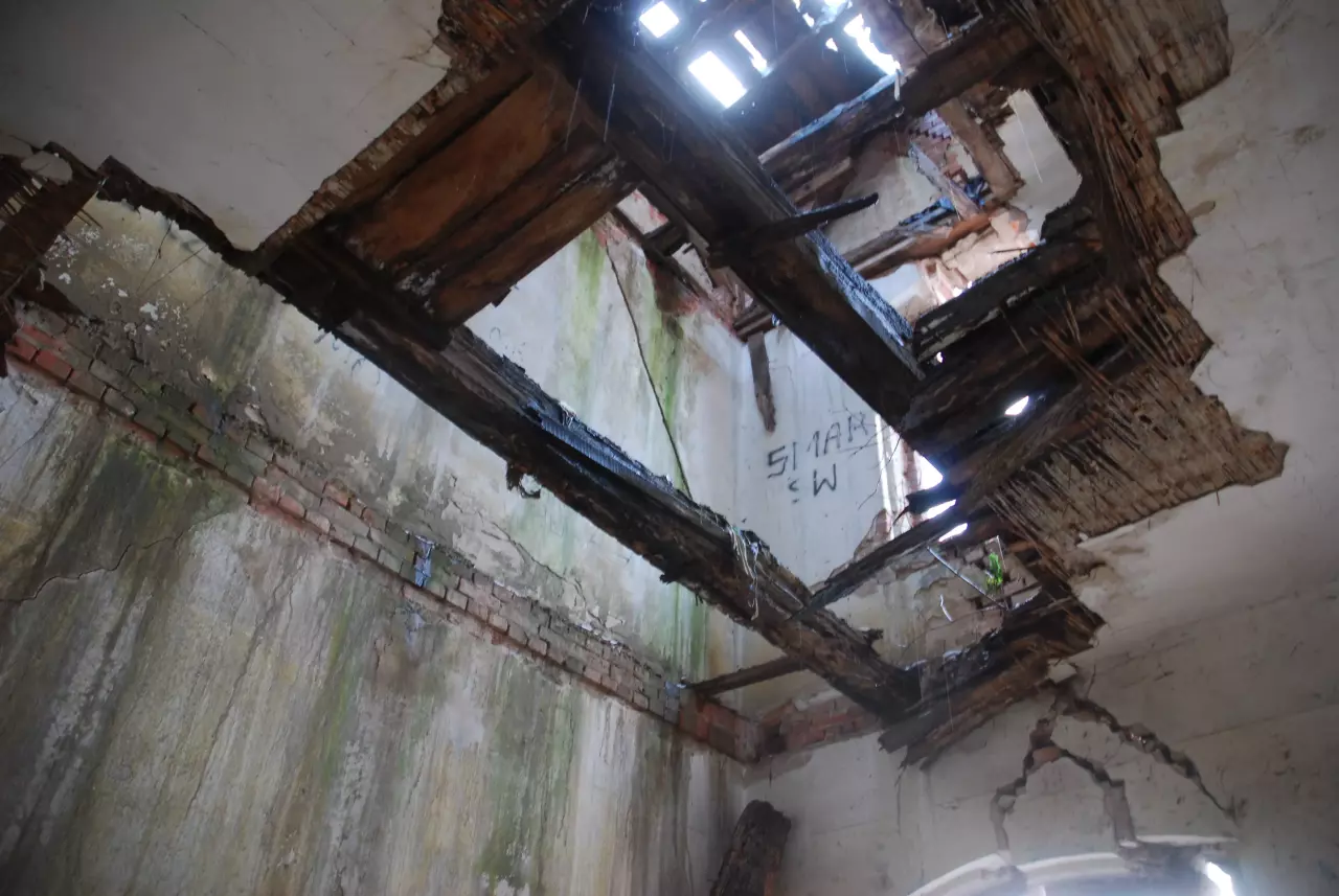 otwarty zdewastowany Na budynku zachowały się jeszcze napisy |