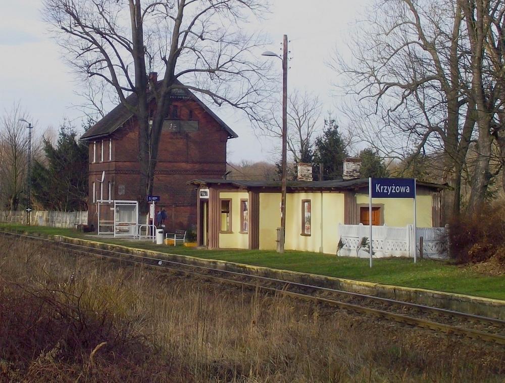 2019-10: Od grudnia 2019 roku przystanek pilotażowo będzie funkcjonował "na żądanie". Opis infrastruktury: Przed II wojną światową stacja posiadała 2 perony, 2 tory dodatkowe oraz budynek ekspedycji towarowej. Do dzisiejszego dnia ostał się ino jeden tor główny linii Legnica - Katowice. Ruch na stacji jest minimalny. (info: wasiukibic, 2007-10-08) Opis budynków: Budynek dworca jest w nienajgorszym stanie technicznym biorąc pod uwagę, że kolejarze opuścili go dawno temu. Oprócz dworca na stacji znajduje się jeszcze kolejowy budynek mieszkalny (tuż przy peronie) oraz budynek dawnego magazynu towarowego, obecnie przerobiony na zakład ślusarski. (info: wasiukibic, 2007-10-08). - p.o. Krzyżowa jest "przystankiem na żądanie". |