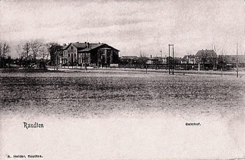 Raudten Huptbahnhof. Na widokówce niemieckiej typu "Gruss aus Raudten".