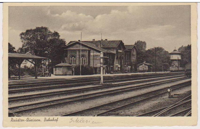 Dworzec kolejowy i jego położenie - na dwuobrazkowej widokówce niemieckiej typu "Gruss aus Raudten". Ze zbiorów Adama Pacześniaka.