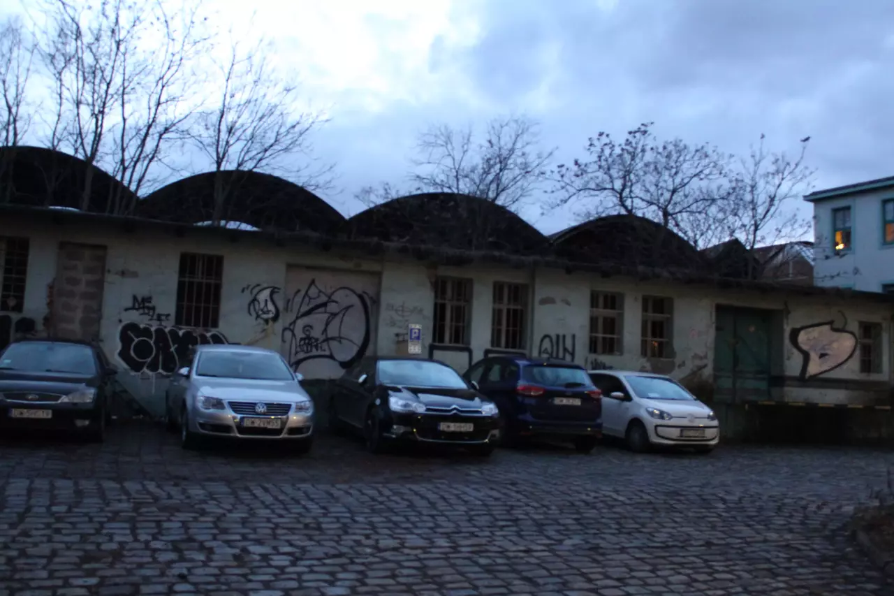 Północna część dworca pocztowego we Wrocławiu. W tle widoczne zadaszenie peronów. Widok od strony podjazdu i ramp samochodowych (ulica Małachowskiego). W lewą stronę Wrocław Główny Towarowy, w prawą Wrocław Główny.