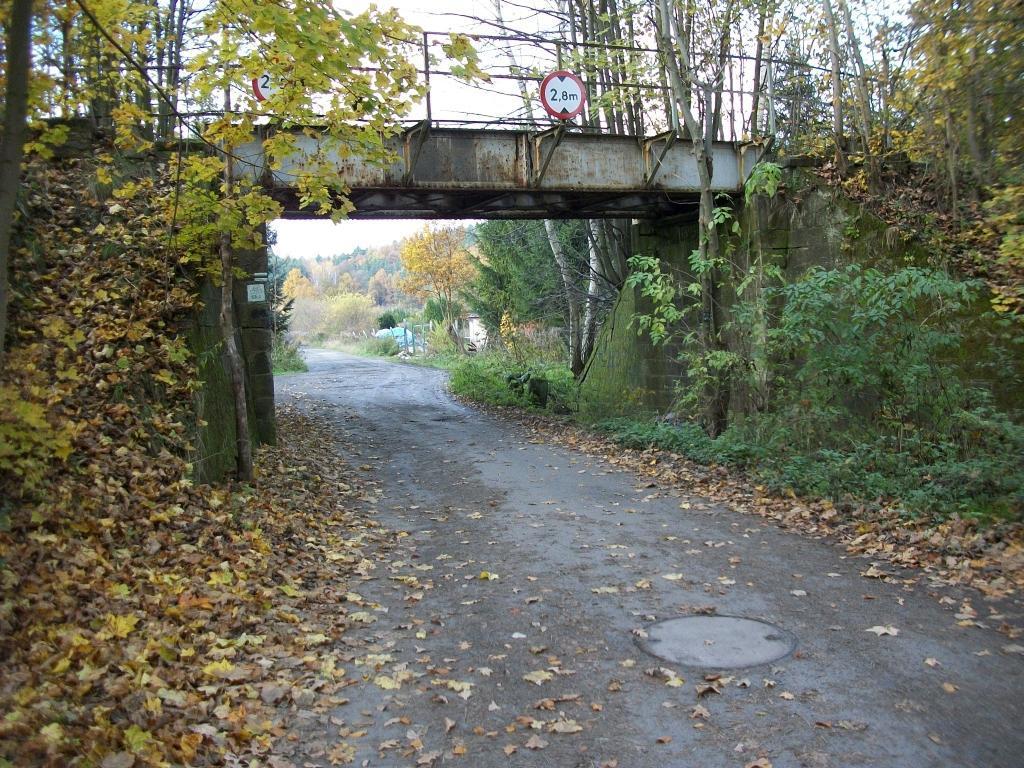 Wiadukt nad ul. Malowniczą w Płakowicach, pomiędzy peronem przystanku, a dawną ładownią (na wprost). Widok w kierunku wschodnim, od strony Lwówka Śląskiego.